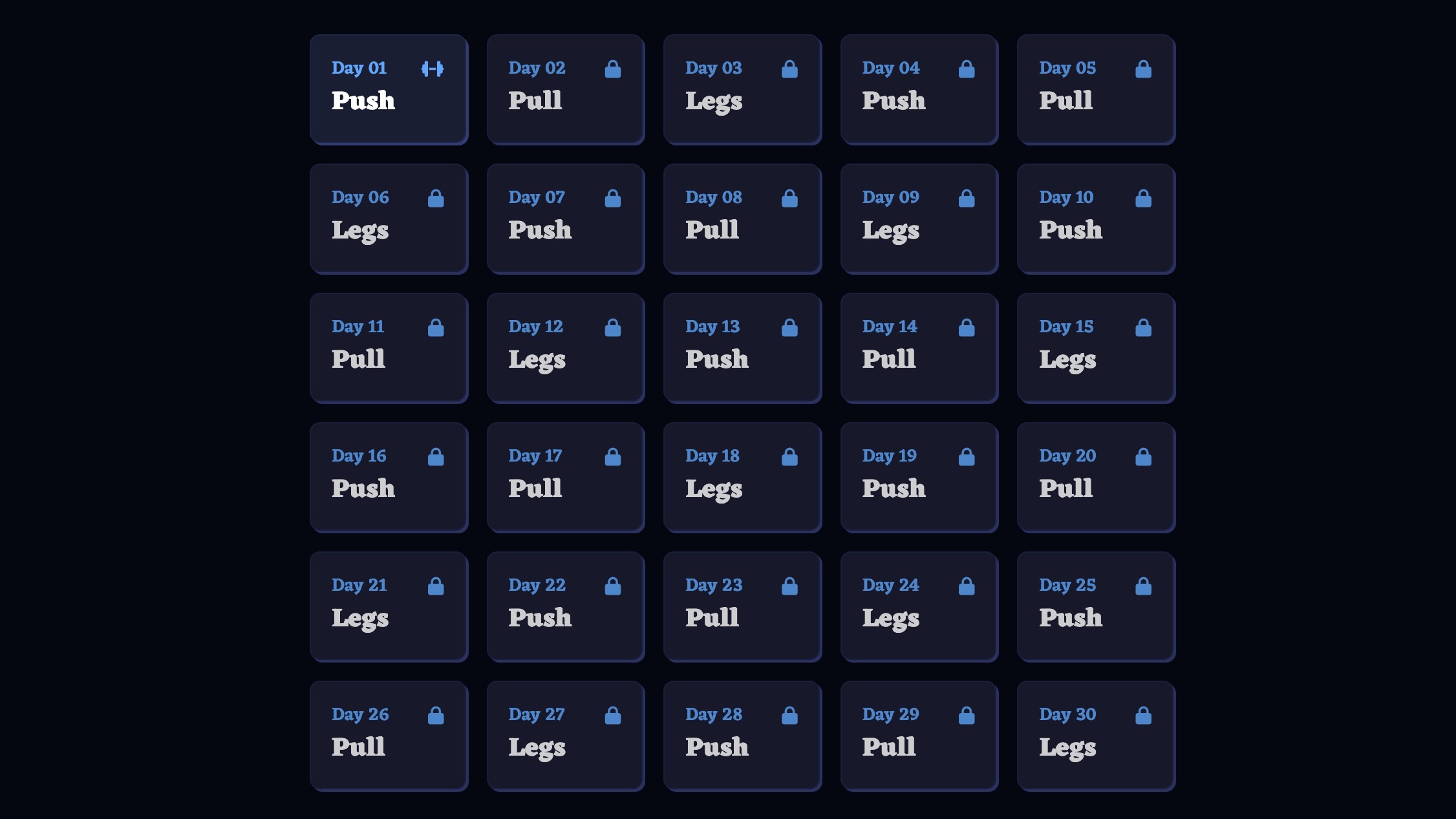 A modern React application that guides users through a structured "Bro Split" workout program. Built with React and Vite, it features an intuitive interface for tracking workouts, following proper exercise tempo, and monitoring progress. The app helps fitness enthusiasts achieve their goals through a scientifically-backed Push/Pull/Legs training methodology.