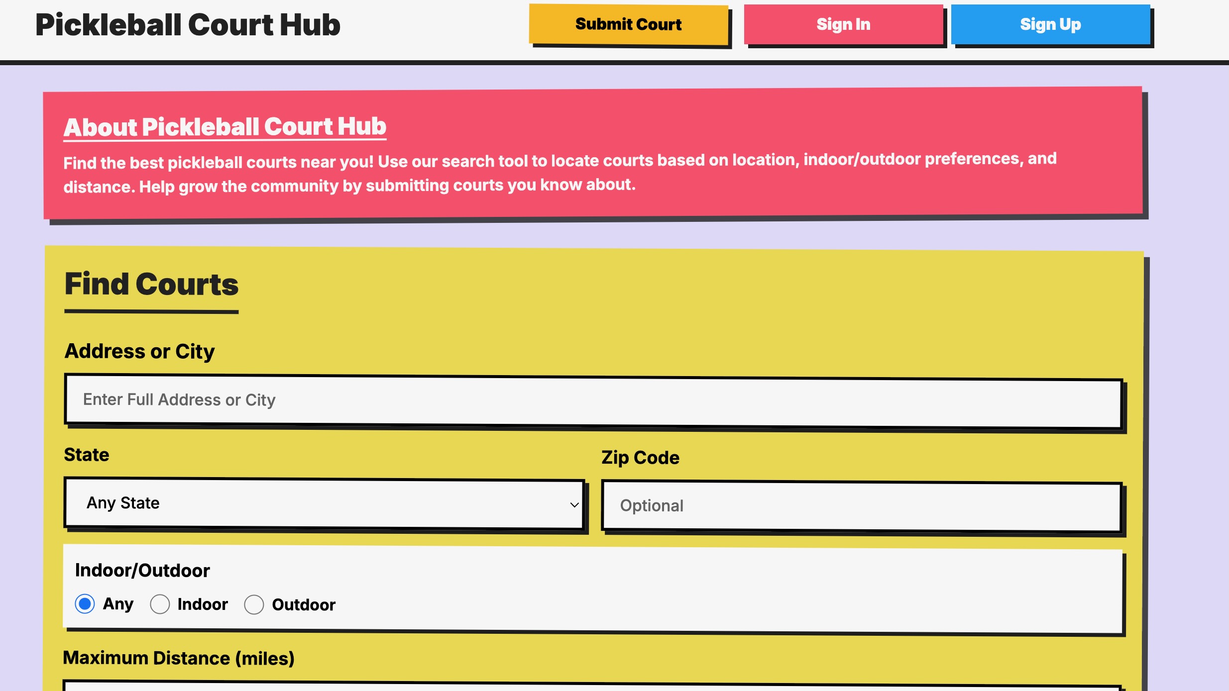 Pickleball Court Hub is a full-stack web app that helps players discover and share courts across the U.S. With an interactive map, real-time search, and user-submitted listings, it makes finding places to play fast and easy. Users can create profiles, add new courts, and connect with their local community. A mobile-first design and admin dashboard ensure the app stays accurate, accessible, and ready to scale.